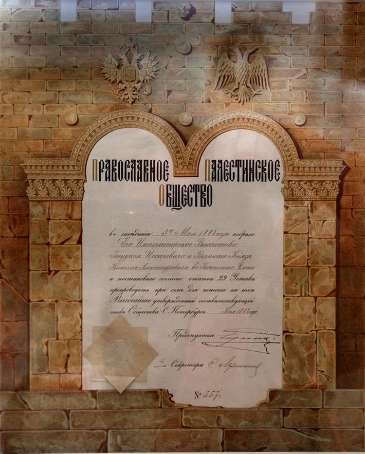 Текст: "Православное Палестинское Общество в заседании 3-го мая 1884 года избрало Его Императорское Высочество Государя Цесаревича и Великого Князя Николая Александровича в Почетные Члены и постановило согласно статьи 29 Устава препроводить при сем для ношения на шее Высочайше утвержденный соответствующий знак Общества. С.Петербург. Мая 1884 г.".