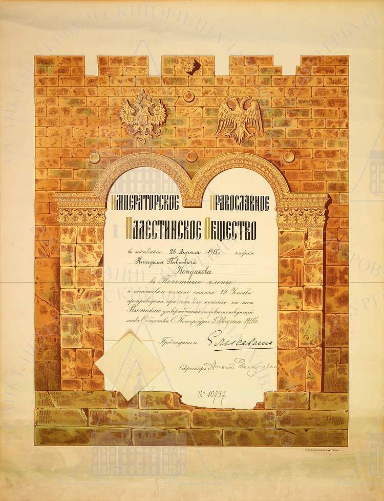 Диплом Палестинского Общества № 10737 об избрании археолога, академика Н.П. Кондакова почетным членом Общества. 1915 г. Архив РАН (Санкт-Петербургский филиал). Ф. 115. Оп. 3. Д. 44. Л. 3. ranar.spb.ru