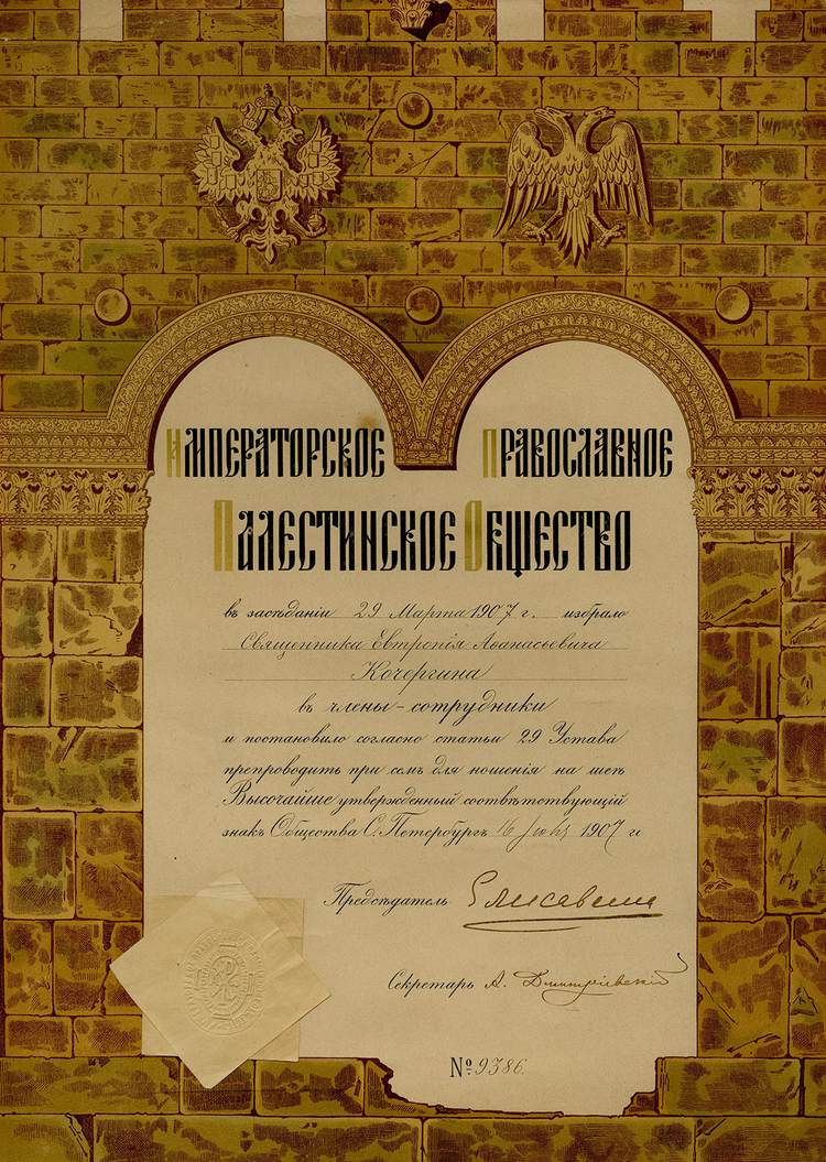 Диплом Палестинского Общества № 9386 об избрании Е.А. Кочергина (25.2.1855  - 13.12.1915)  - священника Покровской церкви в Астрахани    членом-сотрудником Общества. 1907 г. Из личной коллекции С.Ю. Степанова.