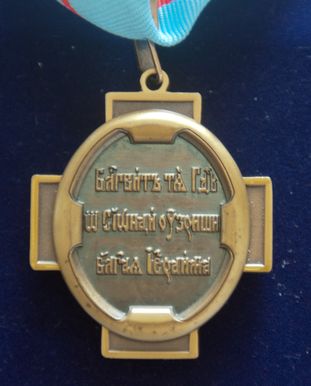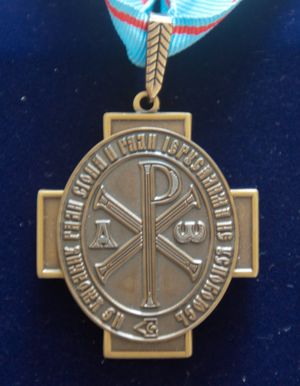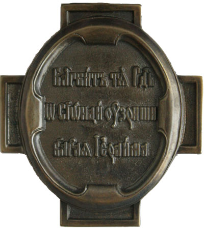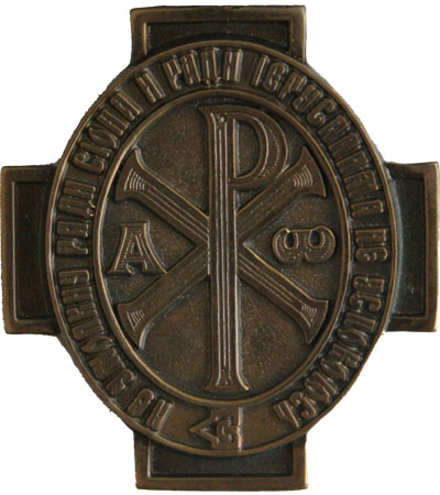 Золотой крест. На нем щит, на белом фоне которого золотая монограмма имени Христа между буквами Альфа и Омега. Кругом щита, на черной ленте слова пророка Исайи (Ис. 62, 1): «Не умолкну ради Сиона, и ради Иерусалима не успокоюсь». Другая надпись на обратной стороне щита, на белом фоне: «Благословит тя Господь от Сиона и узриши благая Иерусалима» (Пс. 127, 5).