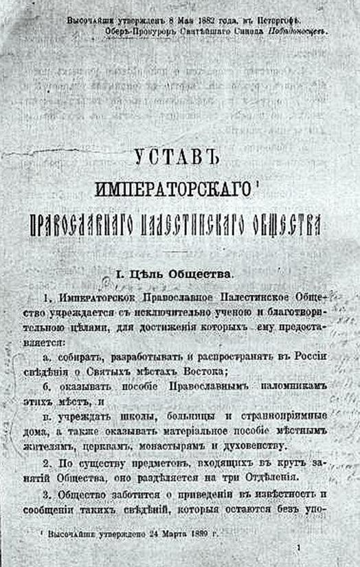 Наиболее важны формулировки, поясняющие для обер-прокурора статьи Устава, касающиеся непосредственных целей Общества. Поскольку главная цель — „помощь нашим поклонникам и поддержание Православия, этими двумя целями обусловливается и третья, издательская, как средство знакомить и поддерживать в русском обществе интерес к святыням Востока. Следует сознаться, что преследование всех этих целей будет зависеть от денежных средств Общества, но я считаю, что даже при малых средствах трудно будет дать преимущества той или иной из этих целей и, насколько мне кажется, даже при ограниченных средствах необходимо будет поделить их поровну для каждого из предположенных отделений“ [49].