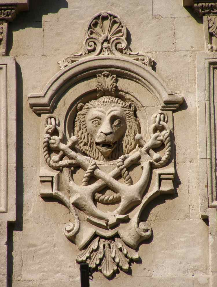 Барельеф в виде львиной морды и скрещенных якорей на фасаде дома Панайотова.
