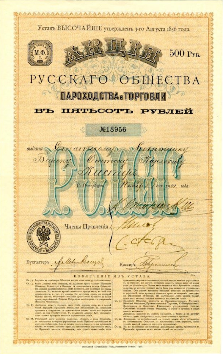 Акция именная в 500 рублей Русского общества пароходства и торговли. С.-Петербург, 1901 год
