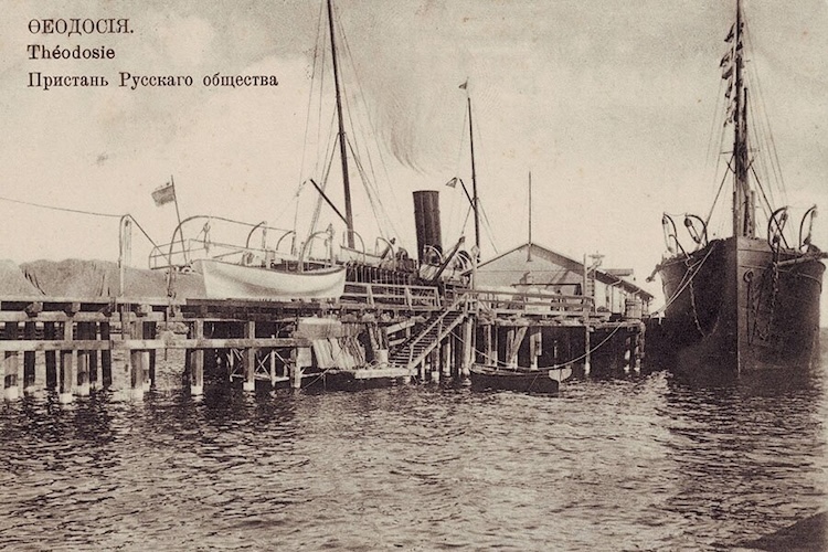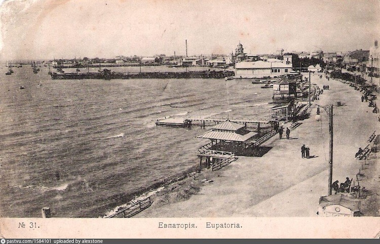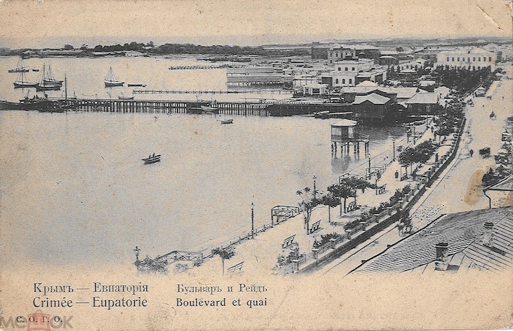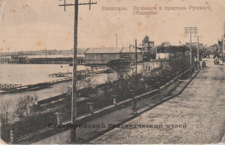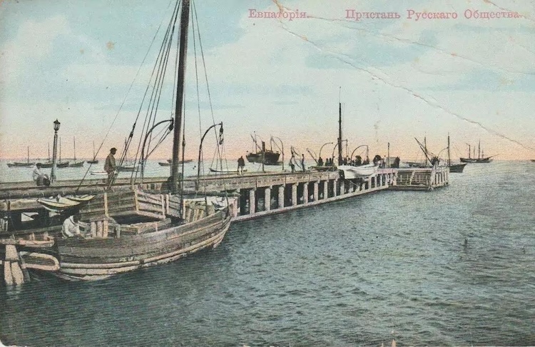 «Из середины берегового полукруга Евпаторийской бухты тянется в море узкою полосою 60-ти саженная пристань, построенная из толстых дубовых бревен и досок и оканчивающаяся не большою площадкой, имеющею форму буквы Т; с решетчатых крыльев этой площадки услужливые за деньги матросы-греки принимают на свои легкие шлюпки во время прихода парохода, пассажиров, и тотчас же их отвозят на стоящий в недалеком расстоянии от пристани пассажирский пароход Русского Общества Пароходства и Торговли. <…> Пароходы приходят из Одессы в Евпаторию по вторникам и пятницам утром, а из Севастополя по средам и воскресеньям в 7 часов вечера <…> главный контингент туристов доставляет море на красивых пассажирских пароходах, принадлежащих Русскому Обществу Пароходства и Торговли». (В.Пьянков. Справочная книжка города Евпатории и его уезда. 1888 г.)