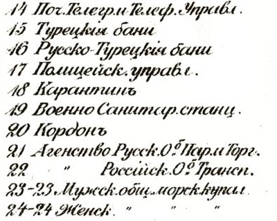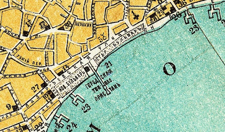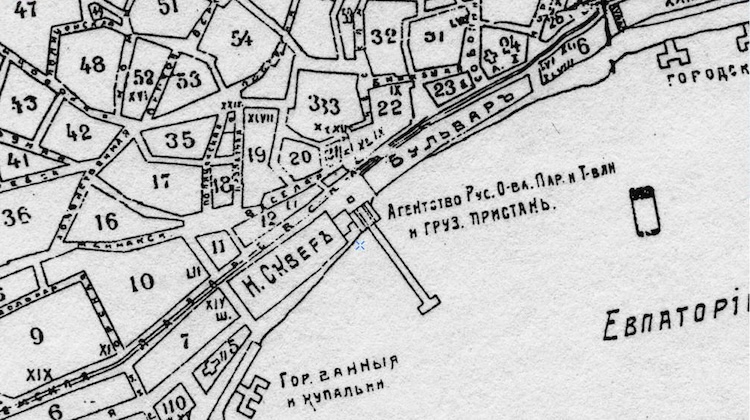 Фрагмент карты Евпатории из книги: "Иллюстрированный путеводитель по Крыму", автор: Григорий Москвич. Издание тринадцатое, типография Л. Нитче, Одесса, 1904 год. Карта отпечатана в литографии Новака, Одесса. Масштаб плана 50 саженей в дюйме. В условных обозначениях под №21 указано Агентство РОПиТ, и пунктир на карте показывает отдельное здание рядом с Новым бульваром (так же известном как городской сквер). Оно находилось на ул. Лазаревской напротив дома Панайотова.