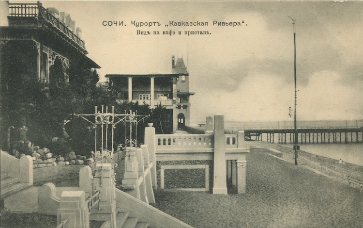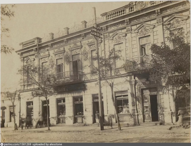 На заднем фоне видна пристань, напротив нее хорошо различим серый боковой трапециевидный фасад дома Панайотова, сбоку от него под красной черепицей одноэтажное здание для торговли, еще не построена примыкающая к нему впоследствии гостиница Бейлера, башенка у пристани РОПиТ тоже еще не возведена. скорее всего фото сделано между 1899 и 1904 гг.