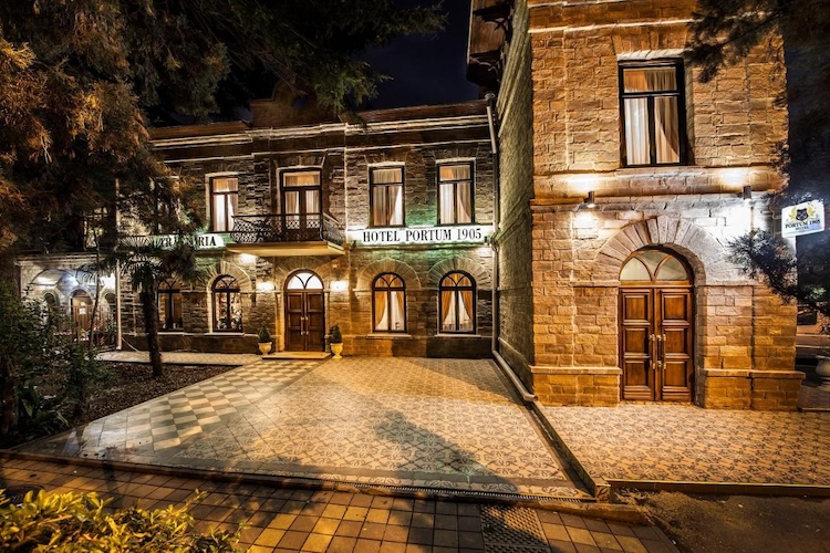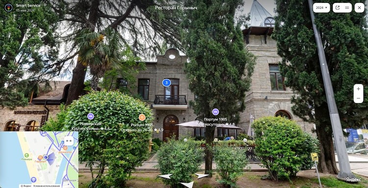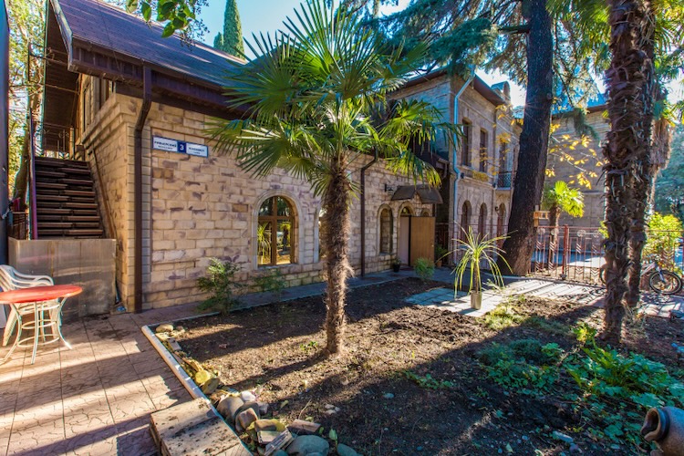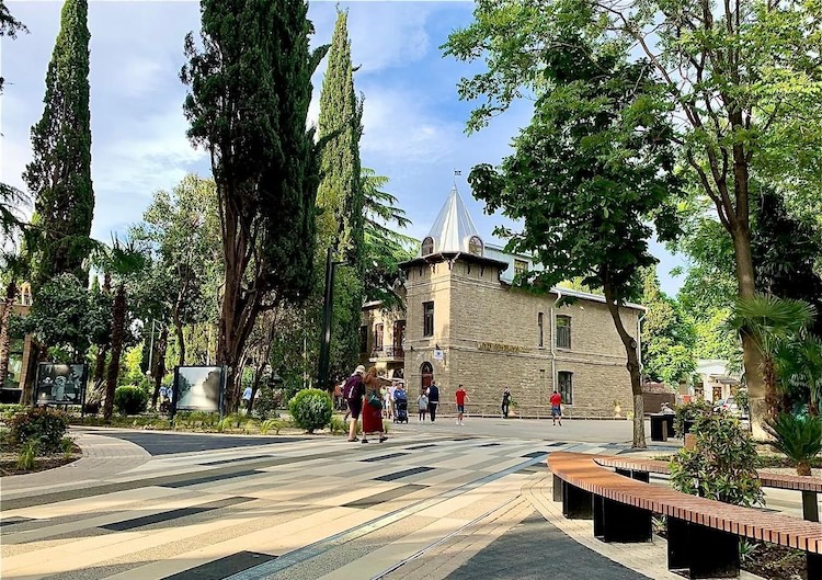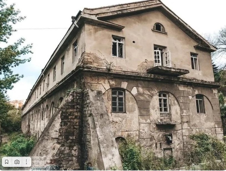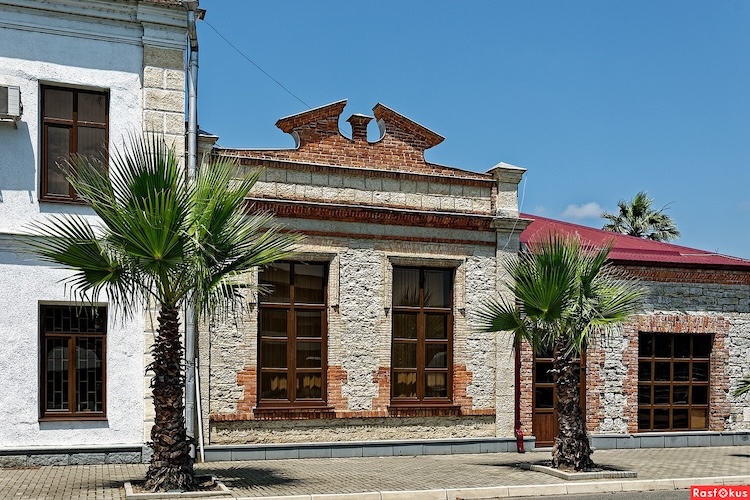 Современный вид зданий РОПиТ в Сухуме. Слева с круглой башенкой здание 1903 года, надстроенный в 1928 году корпус 1880 года, с правой стороны на углу - одноэтажные здания.