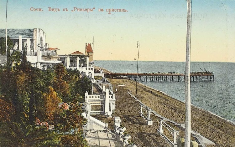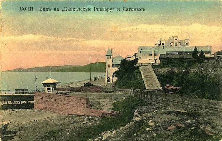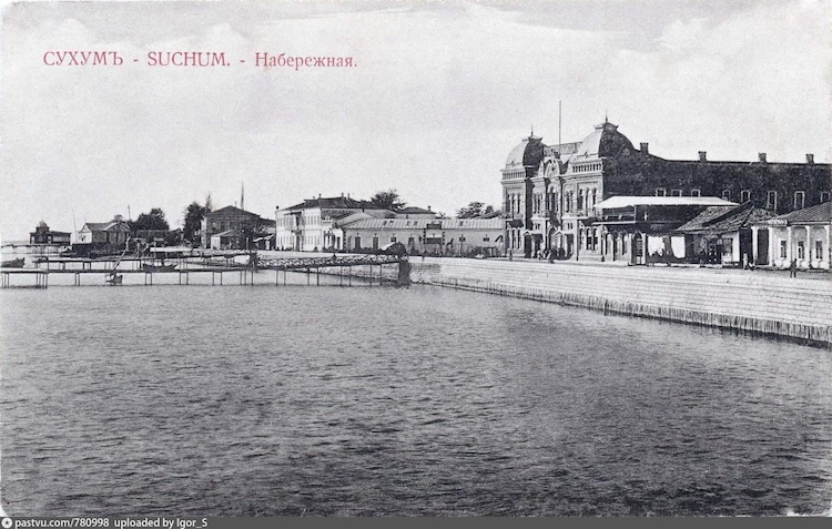 Михайловская набережная в Сухуме. Здание РОПиТ в центре расположенное на углу Михайловской набережной (ныне набережная Мухаджиров, д.66-64) и одноэтажного корпуса по ул. Воронцовский (ныне ул. Конфедератов) д. 1. На боковом фасаде 2 этажа при увеличении различима надпись "Русское общество пароходства и торговли".