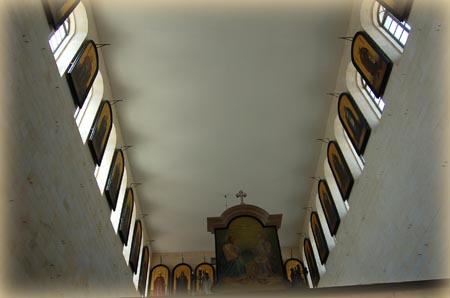 На продольных стенах церкви в рамах висели живописные полотна (3 метра высоты и 2 метра в ширину) Николая Андреевича Кошелева (1840-1918), академика, профессора Петербургской Академии Художеств, талантливого художника, работавшего в Москве в Храме Христа Спасителя, в Петербурге в церкви Воскресения Христова («Спас на Крови»), в церкви приюта братьев Брусницыных, в Свято-Троицком соборе в Иерусалиме, в Александро-Невском соборе в Варшаве, в русских храмах Женевы и Буэнос-Айреса. Тема 18 больших полотен мастера – Страсти Христовы, отражающие эпизод за эпизодом весь Крестный путь Спасителя от Гефсиманского сада до Голгофы, Распятие и Сошествие во ад.