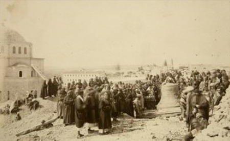 «И вот,— писал архимандрит Антонин,— 105 человек (на две трети женщины) спешно прибыли в Яффу и принялись за дело. Благодаря общему воодушевлению, в течении 7 дней колокол, несмотря на тысячу затруднений, был благополучно доставлен (на руках!) в наши постройки. 5 февраля вечером ему была восторженная встреча, поднявшая на ноги весь город. Затем вся масса паломников взялась тащить колокол на Святой Елеон, к месту его назначения» [16].