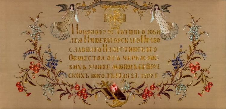 Адрес к 25-летию Императорского Православного Палестинского Общества "от черкасовских учительниц бейрутских школ". 21 мая 1907 г. Шелк, дерево, перламутр, стекло. ГМИР
