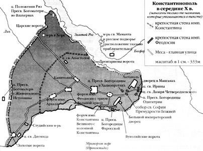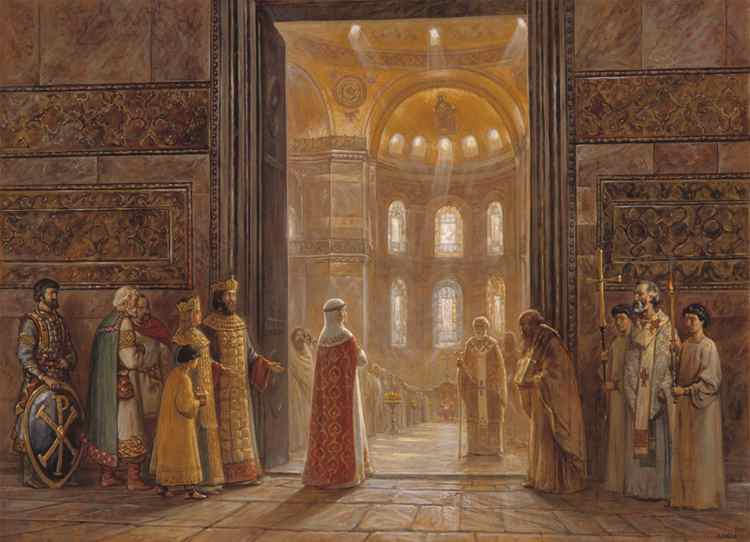 Рано утром в четверг 30 июля в сопровождении всех русских послов и ближних боярынь и под охраной своих же русских, но уже крещеных воинов, которые входили в корпус царской дворцовой стражи и были специально выделены императором ради безопасности русской гостьи, княгиня Ольга переправилась через Золотой Рог и через ближайшие, Друнгариевы[5], ворота была доставлена на Августейон — центральную площадь Константинополя, на которой был расположен и собор Св. Софии. Здесь, у южных дверей паперти, в торжественном облачении ее приветствовал один из синодальных архиереев. Затем он просил княгиню и ее спутников преклонить колена на ступенях храма: разом громыхнуло оружие охраны, и настала полная тишина. Владыка трижды перекрестил всех и негромко, но внятно прочитал краткую огласительную молитву. Опытный толмач, наклонившись к уху княгини, быстро шептал: «Благословен еси, Боже наш… всякое естество словом Твоим создавый… спаси рабу Твою… сопричти ее к стаду Твоему…» — сердце Ольги колотилось от волнения, так что она слышала только отдельные слова. Закончив молитву, архиерей отложил приличествовавшую моменту серьезность и с ласковой улыбкой объяснил Ольге, что теперь она на пути к святому крещению, что ей и ее людям надобно теперь почаще бывать на церковных службах и что по четвергам он сам будет приходить к ней для наставления в вере. Простившись, он оставил давешнего иеромонаха, который должен был сопровождать княгиню, дабы изъяснять ей все, чем бы она ни заинтересовалась.