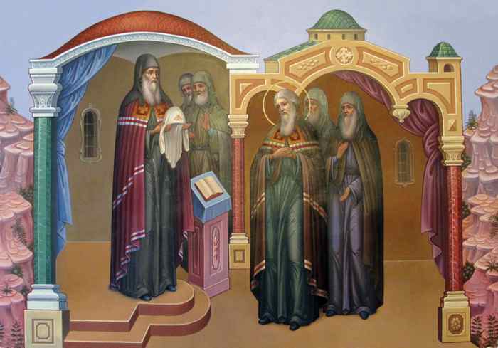 В возрасте около двадцати лет юноша из черниговского Любеча, согласно Летописцу Переяславско-Суздальского XV в., добирается с высокими духовными помыслами в Константинополь, а затем на Афон, где эсфигменский старец игумен Феоктист постригает его с именем Антоний. Димитрий Ростовский [1], комментируя это решающее в жизни новопостриженного монаха событие, сравнивает прп. Антония Печерского с отцом восточно-христианского монашества прп. Антонием Великим (ок. 251 – ок. 356), сближая тем самым предначертания устроителей монашеской жизни в раннехристианское время с христианской эпохой на Руси.