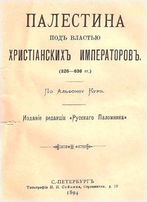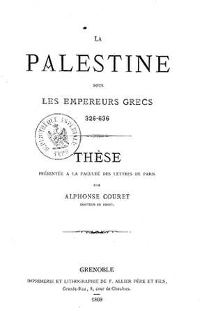 Эта диссертация на степень доктора права, защищенная на факультете искусств в Париже Альфонсом Курэ (Alphonse Couret, La Palestine sous les empereurs grecs: 326-636), была издана в Гренобле (типография Ф. Алье — отец и сын F. Allier patre et fils) в 1869 году небольшим тиражом с литографиями и сразу стала библиографической редкостью.