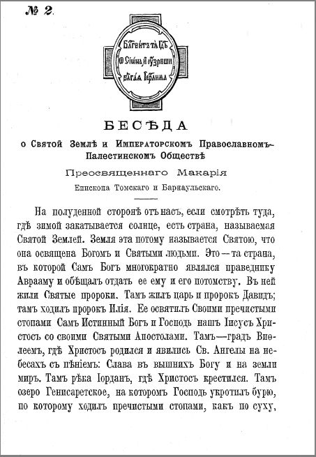 № 2. Беседа о Святой земле и Императорском Православном-Палестинском Обществе (преосвященного Макария, епископа Томского и Барнаульского). 1899.