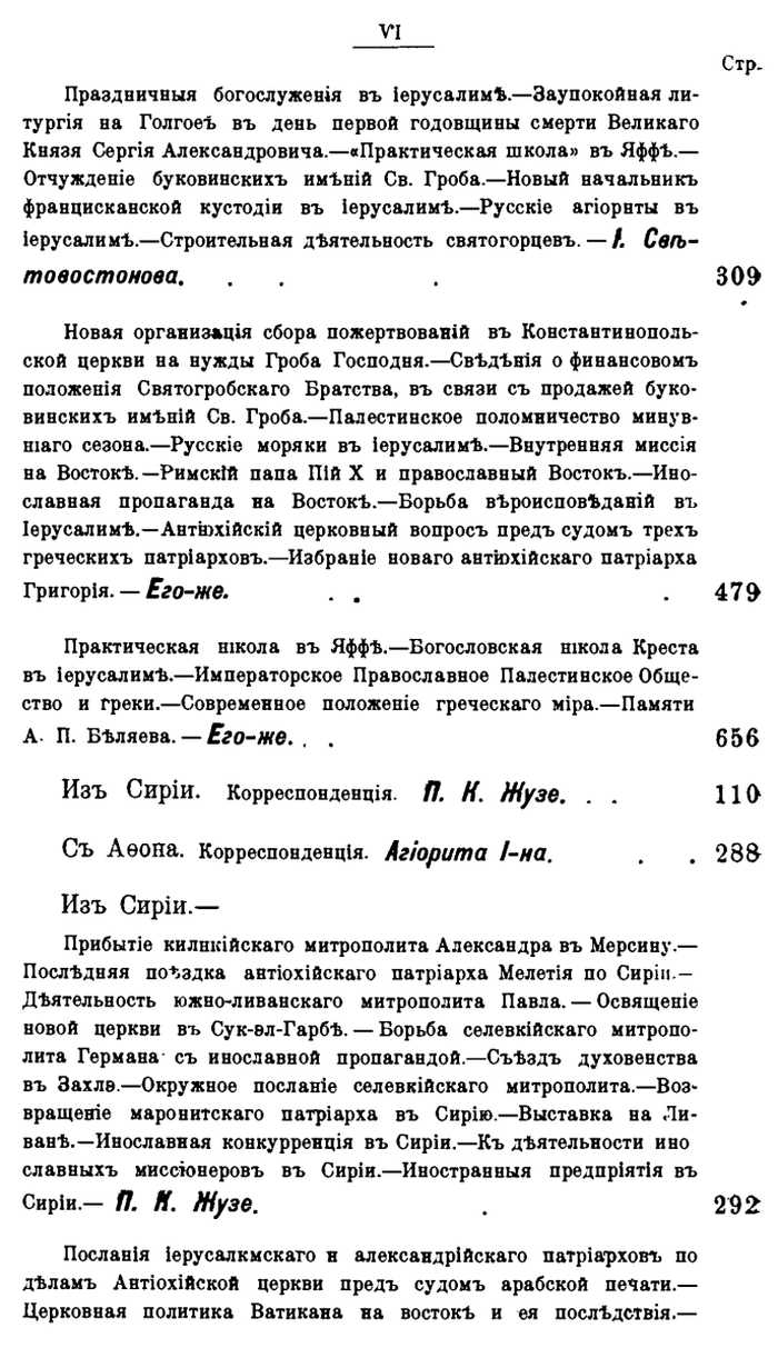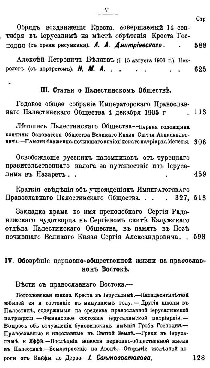 VIII. Летопись Палестинского Общества. Высочайшая отметка на отчете Общества за 1911/12 г. - Высочайшее соизволение на изменение отчетного года Общества на общегражданский. - Высочайшие награды деятелям Общества 2 29 апреля 1913 г. - Посещение Блаженнейшим Григорием IV, патриархом Антиохийским, Канцелярия Общества. - Годовое общее собрание Общества. - Новые председатели в отделах: Одесском, Астраханском, Полтавском и Витебском. - Чтение о Св. Земле в г. Варшаве. - Празднества в школах Общества в Палестине и Сирии по случаю трехсотлетия царствования Дома Романовых. - Десятилетие со дня кончины В.Н. Хитрово. - Панихида на могиле благотворителя Св. Земли протоиерея П.П. Затворницкого. стр. 273