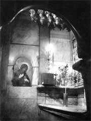 Помолившись с благоговением и сокрушением сердца у гроба Пресвятой Девы Богородицы, мы вышли из гробничной часовни через северные двери. Против этих дверей к северной стене храма прислонился армянский престол. На восток от часовни подземная галерея продолжается еще несколько сажен. В этой части храма имеется вверху единственное в подземелье окно, через которое в пещеру проникает дневной свет.