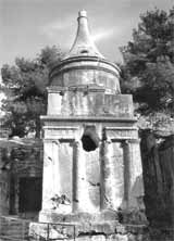 Третья гробница, памятник Захарии, стоит подле пещер Иакова, к югу от них. Гробница Захарии представляет иссеченный из скалы четырехугольник – монолит двух с половиной саженей длины и ширины в основании – и со всех сторон украшена колоннами; она покрыта пирамидальной вершиной, составляющей одно целое с корпусом памятника. Памятник назван гробницей Захарии – вероятно, того самого Захарии, сына Варахиина, который был убит иудеями между храмом и жертвенником. Намек на существование в Иерусалиме гробницы именно этого Захарии можно видеть в словах Иисуса Христа, обращенных к книжникам и фарисеям: Горе вам, книжницы и фарисее лицемери, яко зиждете гробы пророческия, и красите раки праведных, и глаголете: аще быхом были во дни отец наших, не быхом убо общницы им были в крови пророк: темже сами свидетельствуете себе, яко сынове есте избивших пророки… <…> … Да приидет на вы всяка кровь праведна, проливаемая на земли, от крове Авеля праведнаго до крове Захарии сына Варахиина, егоже убисте между церковию и олтарем (Мф. 23, 29 – 31, 35). Памятник Захарии, несмотря на все старания ученых, не открыл еще входа внутрь себя.