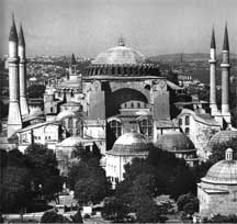 Храм св. Софии воздвигнут греческим императором Иустинианом I. Постройка его была начата в 532 году и продолжалась, по одним сведениям, шестнадцать лет, а по другим – пять лет; строителями были художники Анфимий Траллеский и Исидор Милетский. Храм имеет до пятидесяти сажен в длину, до сорока – в ширину и до пятидесяти в высоту. Главный вход в храм св. Софии, теперь турецкую мечеть, через литые медные ворота; кроме него с северной стороны храма имеется еще боковой вход, через который обыкновенно и впускаются в мечеть путешественники-христиане. За вход в мечеть берется плата (бакшиш), на которой паломник сумеет договориться с муллою; прежде чем войти, путешественник обязан снять сапоги или надеть особые туфли без задников.