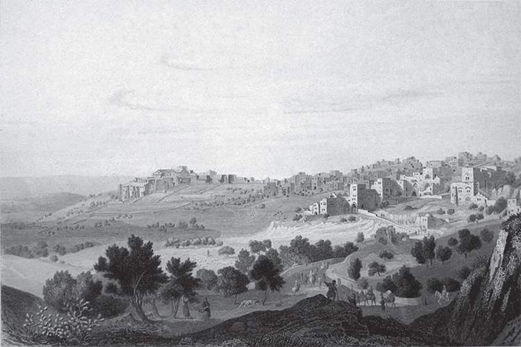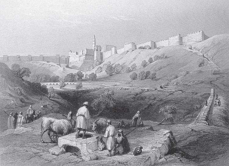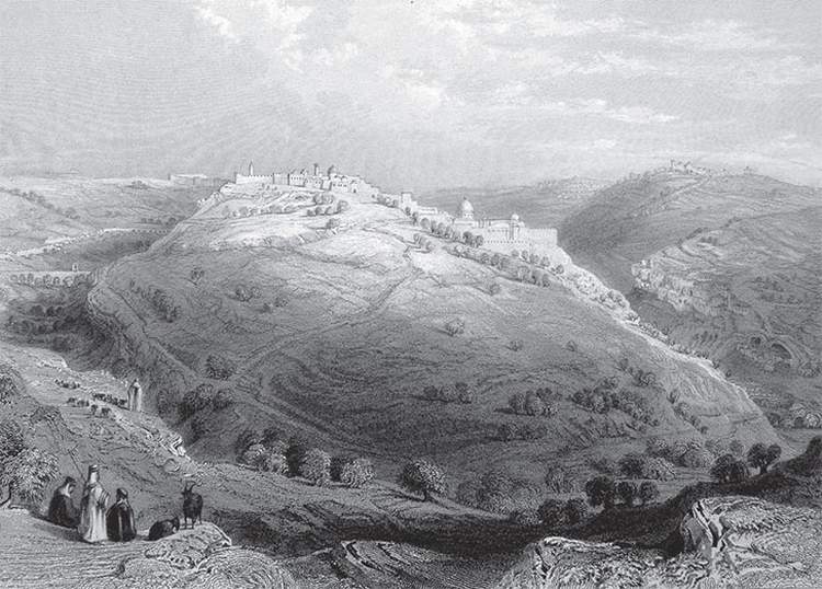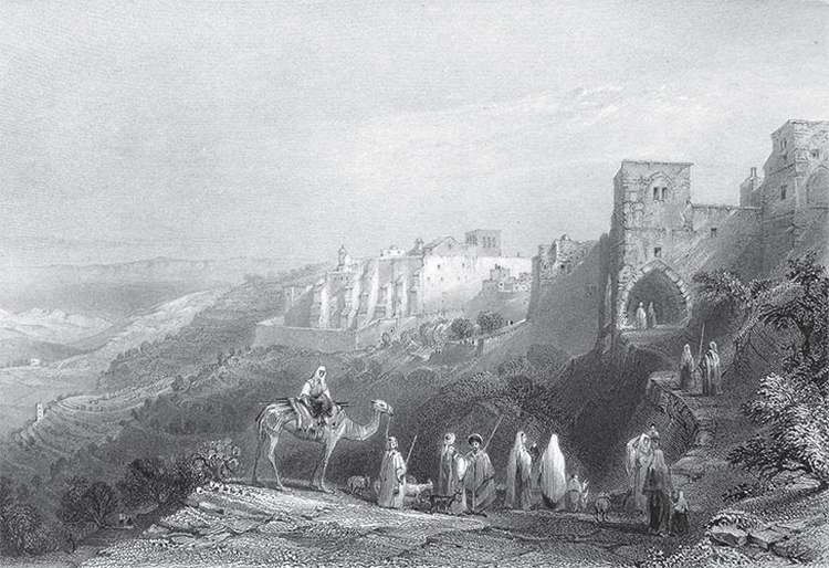 Медленно подвигались мы на встречу чарующему видению. Глаз впивался во все, что мог различить. Но различал он пока не многое. Длинная и высокая, темная стена с двумя массивными башнями посередине закрывала собою все. Башни сторожили западный вход в город, так называемые Яффские ворота, хорошо известный свету по рисункам. Они должны примыкать к Замку Давидову, но и замок вместе с городом не виден был нам; напрасно также взор искал гор Cионской и Элеонской. Все, что возвышалось над окраиной стены, было два-три минарета, два-три плоских купола, и какое-то круглое здание новой постройки. В отдалении, правеe Иерусалима, чернелось на возвышенности какое-то большое здание, окруженное садом, единственный предмет, коим оживлялась мертвая окрестность. Сначала я счел его за Вифлеемский храм, обманутый малым сходством, но расстояние до него, по глазомеру, не больше пяти-шести верст, обличило меня в грубой ошибке. По тому же направлению, но ближе к городу, лежало обширное кладбище турецкое со множеством памятников, из коих некоторые имели вид малых храмов с куполом. Западнее кладбища виделась огромная четыреугольная яма, высеченная в скале служащая водоемом городу, как мне объяснили. Влево от нас, чем далее от дороги, тем чаще показывались деревья, большею частию масличные, которые на параллели Иерусалима образовали уже как бы целую рощу закрывавшую с этой стороны горизонт.