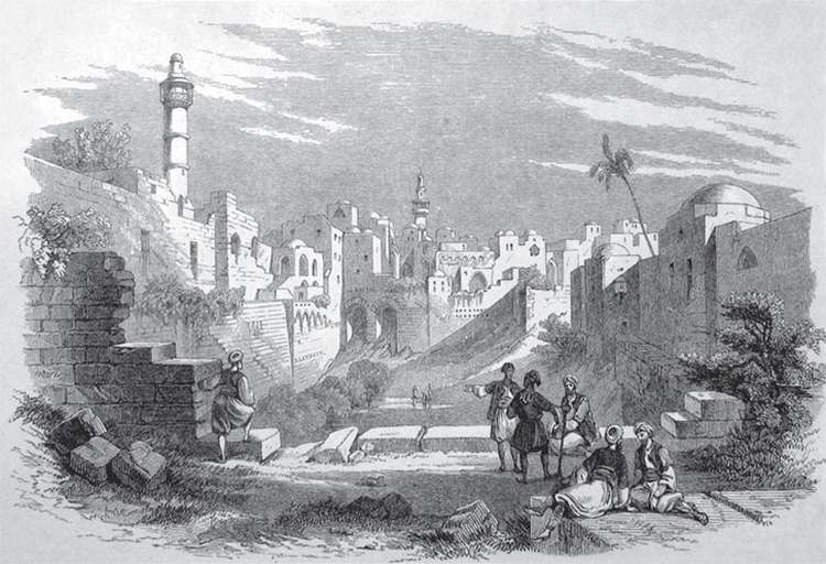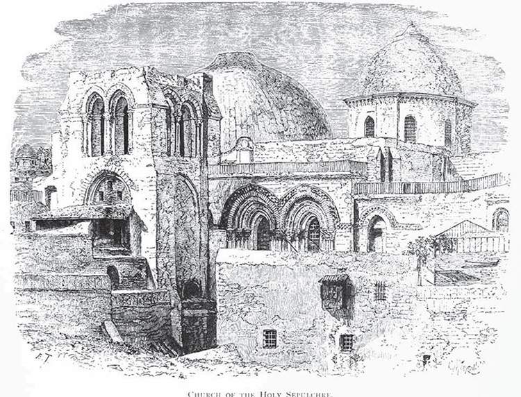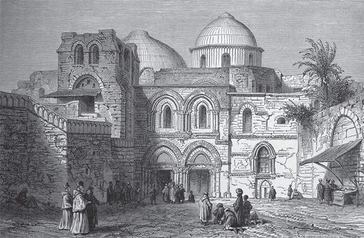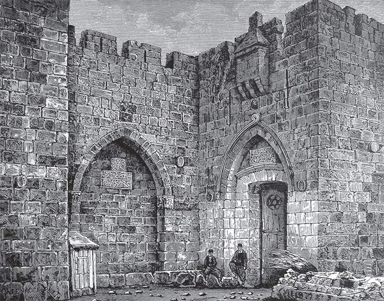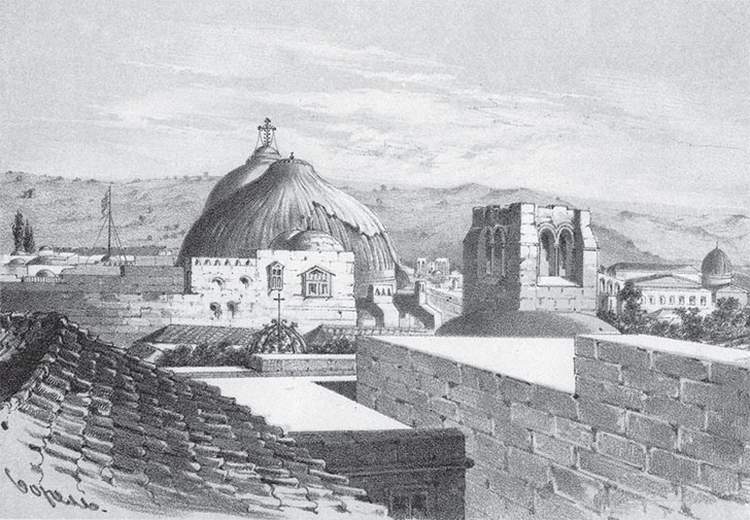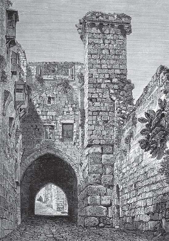 Утешение было мне весьма нужно. Вышед с площадки малыми и низкими воротами на городскую улицу, мы вскоре увидели себя середи духоты и нечистоты невообразимой. По левую руку от нас было кожевенное заведение, распространявшее зловоние на далекое пространство. По правую руку несколько далее стояли открытые великолепные ворота готического стиля, ведущие на довольно пространный двор, и со двора в полуразрушенную церковь того же стиля. И двор и церковь наполнены были нечистотою до омерзения. Я узнал, что тут была славная странноприемница знаменитого ордена храмовых рыцарей[9]. Мне невольно припомнилась при этом того же стиля прекрасная церковь в Абугоше, также обреченная на поругание. Стало невыносимо грустно и даже страшно при виде таких поразительных свидетельств не принятого Богом усердия крестоносцев. Миновав этот отвратительный квартал, в укор христианскому имени соседствующий с Гробом Господним, мы вместе с улицей повернули налево, и скоро увидели перед собою древнюю стену Иерусалима с большими воротами. Не доходя до нее, вожатай наш указал мне по левую руку, между грудами разваливающихся бедных построек, стоящую колонну, и сказал, что, судя по размерам, ее надобно считать принадлежащею к колоннаде храма, остаток которой мы видели вверху на площади. По заключению его надобно думать, что храм царицы Елены начинался от самых стен тогдашнего города, из ворот которого прямо восходили к его алтарю.