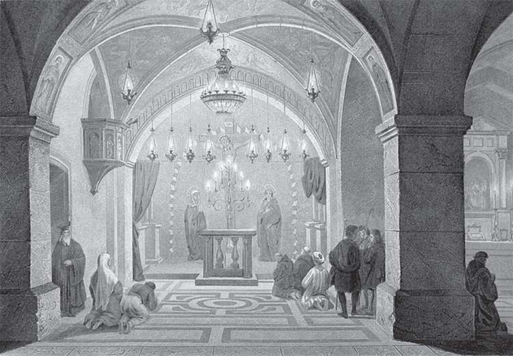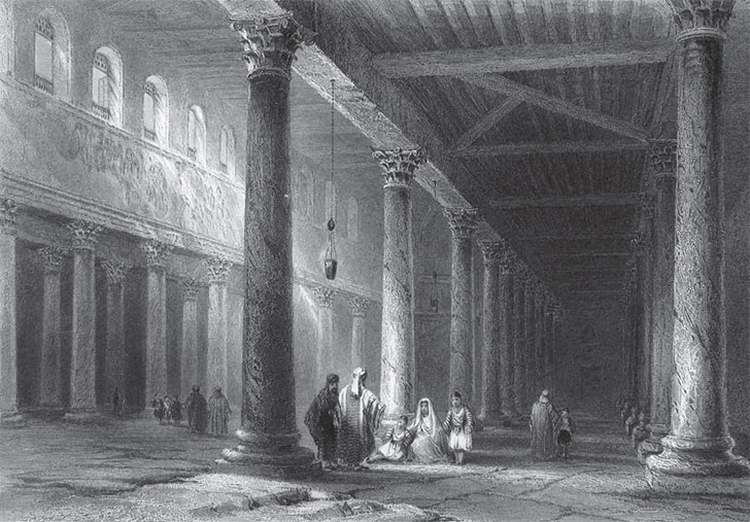 Мы уже намеревались идти обратно в церковь, как нам предложено было возвратиться в нее подземными переходами латинского монастыря. Заблаговременно дано было знать о том «фраторам», а потому на первый стук вожатого нашего в небольшую дверь, находящуюся с северной стороны вертепа, она отворилась, и мы пошли узким переходом, направляясь все к северу, за каким-то монахом, лицо которого дышало добротою и усердною готовностью. На пути нам показывали комнатку блаженного Иеронима, не украшенную ничем и вероятно оставшуюся такою, какою была при подвижнике, и невдалеке от нее – другую комнату двух учениц его: Павлы и Евстохии. Великий муж, краса и слава латинской Церкви, может быть почитаем родоначальником всех, спустя после него несколько веков двинувшихся в Святую Землю латинян. Он первый показал Востоку характерное несходство двух половин Христовой Церкви восточной и западной. Не с него ли начались те нескончаемые споры греков с латинами, которые, к позору христианства, окружают и колыбель, и гроб Спасителя мира доселе? Отзыв о нем Лавсаика как «о человеке неуживчивом», повидимому, может подтверждать мысль эту[4]. В келье его, смотря на водившего нас западного инока, по-видимому кроткого и простодушного, и из обращения его с нашим вожатым, замечая их близость и некоторую степень взаимного уважения, я радовался возобновляющемуся миру в земной отчизне Примирителя. Не есть ли в самом деле величайшая несообразность отвечать на благовестные слова ангела – «Слава в вышних Богу и на земли мир», – враждою и ожесточенною бранью самых приближенных ко Христу, и по месту, и по званию лиц, Его служителей? И где же это? Пред лицом неверия посмеивающегося святейшим таинствам христианского исповедания! Знаю, что мне скажут: «Легко говорить, а не так легко сделать», – и предложат самому пожить и испытать трудность соблюдения мирных отношений между людьми, отстаивающими свою собственность и людьми, не признающими за ними сей собственности. Но и сознавая справедливость всего этого, все же можно думать, что при большей общительности и искренности настоятелей той и другой половины, значительная часть столкновений была бы избегнута. Подходя к церкви латинского монастыря, мы рассматривали сокровищницу ее. Заметив при этом, что мы на все обращаем внимание, соединенное с благоговением, добрый вожатый еще более хотел умилить нас и отдернул занавесь одного небольшого шкафа. Как же неприятно поражены были мы, увидев там лежащее на пеленах восковое розовое дитя с блестящими глазами, неподвижно устремленными на нас! Мне даже жаль стало бедного патера, который, без сомнения, заметил наше общее несочувствие к его Bambino Divino. Церкви Святой Екатерины мы не могли разглядеть хорошо при слабом свете держимых нами светильников. Из нее мы вышли в так называемые Колонны. Меня поразило зрелище неожиданное, могу сказать, хотя и давно искомое. Я был в Юстиниановом[5] храме Рождества Христова. Ряды колонн, при недостаточном освещении казавшихся гигантскими, перекрещивая во всех направлениях обширную залу, живо напомнили мне собою великую церковь Святого апостола Павла «за стенами» Рима. Обходя этот каменный лес, я горько чувствовал однакоже пустоту и неубранство великолепного некогда храма, теперь совсем оставленного, даже не считающегося храмом, а просто называемого Кол