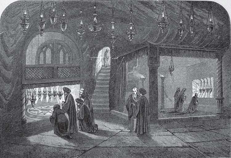 Уже были сумерки, когда мы подъехали к высокой стене с крепкими воротами. Мы сошли с лошадей и изъявили желание немедленно видеть храм Рождества Христова и богоприимный вертеп. По данному знаку ворота отворились, и мы вступили на небольшой четыреугольный двор, примыкающий к церкви с южной стороны. Впереди нас отворялась уже дверь (южная) самого храма. Войдя ею в церковь, мы увидели себя как бы на балконе, с которого должны были спуститься на помост церковный многими ступенями. Зная хорошо план этого замечательнейшего из христианских храмов, я сначала потерялся в соображениях, увидев себя в громадном, но несообразно укороченном здании. Нам дали в руки зажженные свечи, и при пении греческого тропаря Рождеству Христову мы стали спускаться по мраморной лестнице под церковный помост, откуда исходил целый поток света. Спуск этот был впереди алтаря под возвышением или солеею. Сошед вниз, мы очутились в пещере неправильной формы, освещенной множеством лампад, по подобию Гроба Господня, повешенном в одном из углублений ее. В сем месте вертепа родился Господь наш Иисус Христос. Углубление перегорожено горизонтально доскою, служащею престолом при совершении литургий. Под сею доской вставленная в мрамор пола серебряная звезда с латинскою надписью обозначает место события. Из этой главной части вертепа двумя ступенями спускаются в боковую (к югу) ветвь его или придел яслей, также освещенный множеством светильников. Стоя там, я слышал и не слышал, как обязательный о. Вениамин отправлял по-русски литию, поминая при этом по обычаю и наши имена, которым, казалось, неуместно было оглашать собою священное подземелье, где раздавались первые человеческие восклицания Слова Божия. Нельзя описать того чувства, которым переполнена была душа, когда мы слушали вслед за тем по-славянски чтомое Евангелие от Луки о Рождестве Христовом, так хорошо известное, но теперь казавшееся новым от поразительного сосвидетельствования ему самого места. Помолившись и приложившись к святыням, мы осматривали святую пещеру. Она вся вымощена мрамором равномерно, и стены ее до некоторой высоты также одеты мрамором, но свод оставлен таким, каков, вероятно, всегда был. Впрочем, он закрыт от любопытного взора подвешенною к нему материей, довольно убогою и старою. Сделано это, как говорят, в предотвращение покушений поклонников отбивать себе на память по кусочку от священной скалы. Этим объяснением может успокоить себя тот, кому бы хотелось, чтобы вертеп оставался доднесь в том самом убожестве, в каком был во времена Христовы.