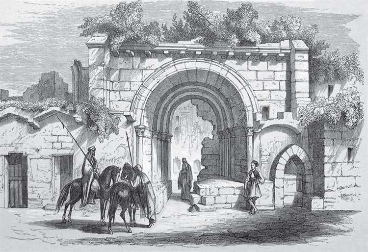 Было восемь часов, когда дано было приказание «вставать и ехать». Мое ложе было в самых дверях здания. Подняв голову, я с изумлением увидел, что мы находимся в большой, совершенно опустелой церкви с двумя рядами столбов и готическими арками. Достойная сожаления участь храма Божия, некогда великолепного, теперь же обращена, стыжусь сказать, во что! Не ожидал я такого горького привета от многорадостного дня. Стены и своды церкви еще в совершенной целости. По стенам, внутри храма, во многих местах сохранились очерки и краски икон. «Сколько ее на верху, столько же и под землей», — сказал мне наш кавас, указывая на церковь. Я обошел ее кругом, и действительно с южной стороны под алтарем увидел спуск в глубокое подземелье. Проникнуть туда уже не решился, боясь и отвращаясь нечистоты. Кем, когда и в память чего выстроен этот замечательный храм? Некому было объяснить мне это. Архитектура его явно обличает время Крестовых походов. Раумер в своей «Палестине» считает его остатком монастыря братьев Миноритов. По его мнению, Абугош есть древний Кариаф-иарим, славный местопребыванием Ковчега Завета. Но пустившись отсюда в дальнейший путь, я уже на дороге прочел в одном писателе, что Абугош есть евангельский Эммаус, и что церковь выстроена на месте явления Иисуса Христа ученикам по воскресении. Это известие глубоко поразило меня. Я доверился ему охотно.