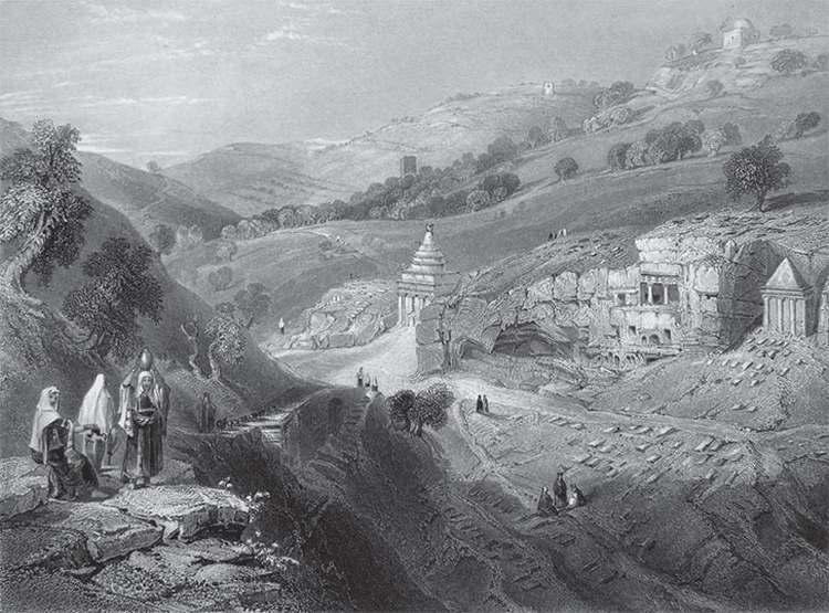 Мы ехали другою уже дорогою от училища, направляясь почти прямо на Яффскую дорогу. Пересекши ее, держали путь на север и скоро въехали в Масличную рощу Провожавший нас мальчик сперва уверял нас, что он знает хорошо Гробы Царей, но потом показал вид, что не понял нас. Таким образом, мы сами должны были искать их. Заметив в стороне одного араба, мы отнеслись к нему с вопросом, но он предварительно потребовал от нас денег. Спутник сказал ему на это: «Если бы ты не договаривался заблаговременно, у тебя был бы сегодня хлеб. Теперь нам тебя не нужно. Дорогу мы знаем». Араб поспешил оставить нас, вопреки моему предложению… В услугах его, впрочем, не было нужды. Обширная яма означила сама себя издалека. Достигши ее, мы по осыпавшейся земле спустились внутрь ее. Перед нами к северу стояла прямо обсеченная скала, с выдолбленною в ней пещерою в виде длинных сеней, коих навес спереди не поддерживается ничем. Мы сошли с лошадей. Походив по сеням, я увидел в западном конце их малое отверстие в земле, ведшее наискось под стену. Откуда ни возьмись, прибежало несколько детей с восковыми свечками, и кто зажигал их, кто, уже спустившись в отверстие, подавал оттуда руку… Ясно было, что оставалось нам делать. Спустились и мы туда же и, проползши под стену, очутились в малой комнате, заваленной землею и камнями, между коими виделись и толстые каменные створки, замыкавшие некогда вход в нее. Из комнаты этой были низкие и тесные выходы в боковые отделения, состоявшие опять из комнат с дальнейшими выходами. В устроении этого, нацело высеченного подземелья заметна большая тщательность и правильность. Видно, что работа точно царская. Поспешив выйти на чистый воздух, я любопытствовал знать, нет ли в противоположном конце галереи такого же спуска, но дети уверили, что там ничего нет. Оставалось рассмотреть идущий поверх пещеры карниз греческой или римской работы, высеченный по отвесу скалы и представляющей попеременно то триглифы, то венки. Увидев это собственными глазами, я убедился вместе с другими, что это не гробницы древних царей Давидова рода. Других заключений я не делал, боясь вмешаться не в свое дело. И старался разузнать, где другие гробницы, древнейшие этих, носящие имя Судей, но не нашел никого, кто бы мог указать их.