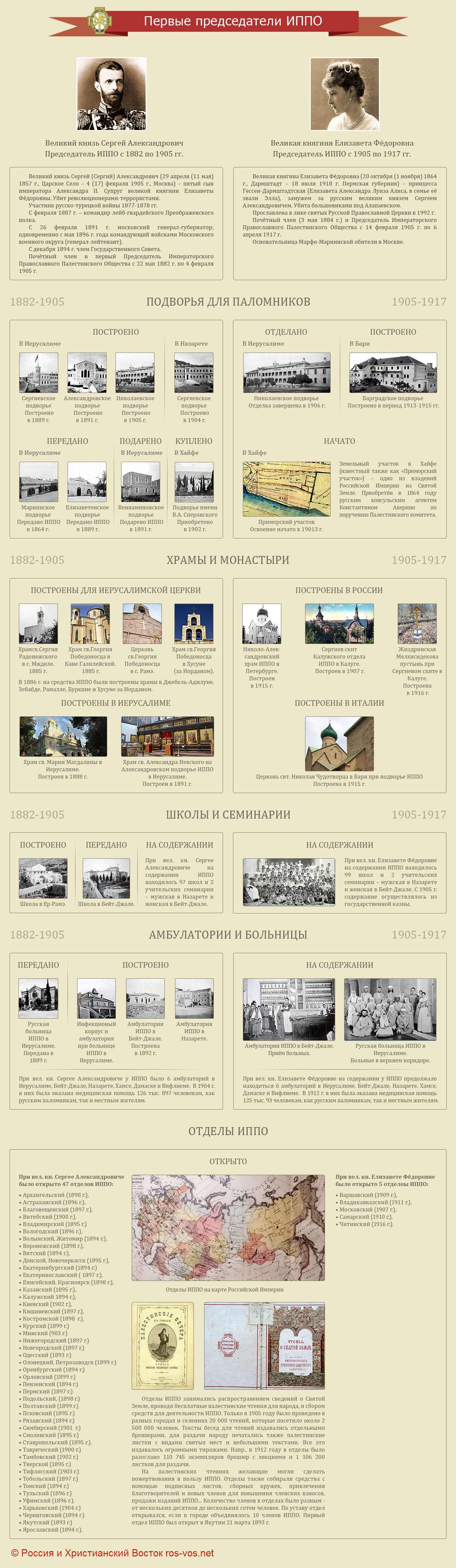 До революции 1917 года председателями Императорского Православного Палестинского Общества были великий князь Сергей Александрович (с 1882 по 1905 гг.) и его супруга великая княгиня Елизавета Федоровна, занявшая этот пост после убийства Сергея Александровича террористами (с 1905 по 1917 гг.).
