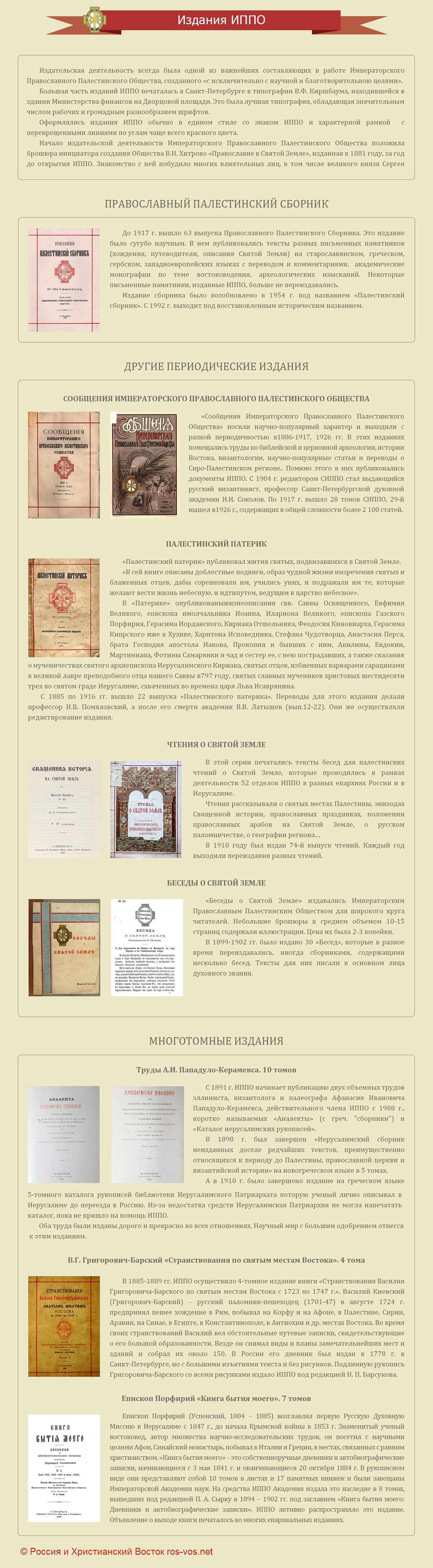 Издательская деятельность Императорского Православного Палестинского Общества была очень насыщенной. Основным академическим изданием был "Православный Палестинский сборник". Кроме него выпускались издания более популярного характера, рассказывающие о святых подвижниках, Святой Земле, ее истории, географии, святых местах, жизни местных православных народов.