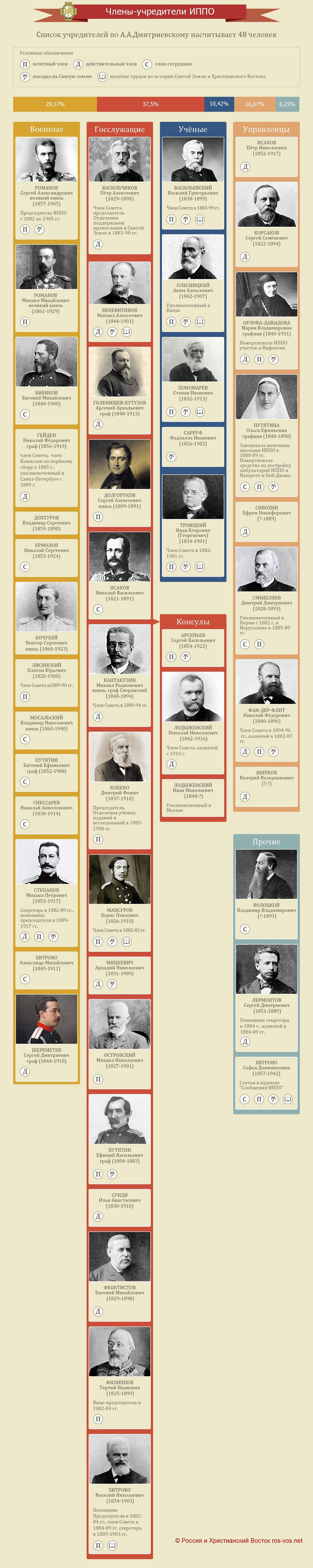 Существует несколько вариантов списков членов-учредителей Императорского Православного Палестинского Общества. Предлагаемая инфографика иллюстрирует список, составленный секретарем ИППО в 1907-1918 гг. профессором А.А. Дмитриевским. Род их деятельности дан примерно на момент создания ИППО, ранее и позднее этого периода они могли заниматься другим видом профессиональной деятельности.