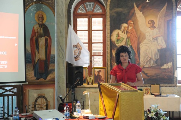 Свое выступление я построила на основе анализа очень интересных социологических исследований, проведенных в 12 регионах Российской Федерации и, в том числе, я сама лично участвовала в 2-х социологических исследованиях, которые мы проводили в Нижнем Новгороде совместно с администрацией нашего города и департаментом по делам молодежной политики. Эти интересные сведения как раз касались вопросов взаимоотношения молодежи, Церкви и государства, и нам бы хотелось сделать некоторые выводы, которые вместе можно было обсуждать и далее делать какие-то конкретные шаги по привлечению молодежи к деятельности международной общественной организации Императорское Православное Палестинское Общество.