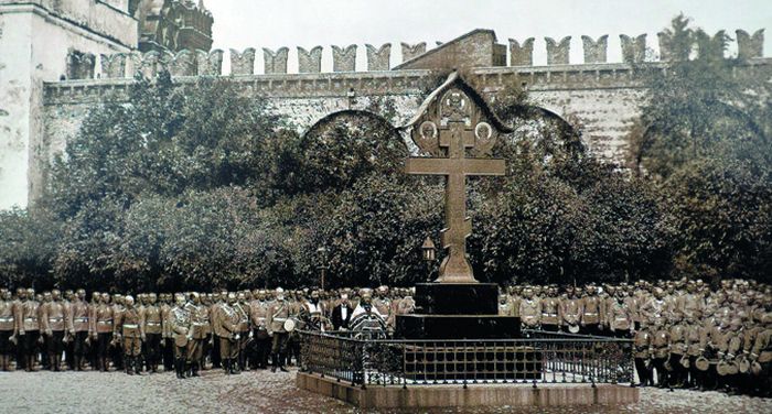 В 65 шагах от Никольской башни Кремля сегодня — пустая мостовая. Мало кто помнит, что это место убийства генерал-губернатора Москвы Сергея Александровича Романова, и на этих камнях когда-то стоял крест-памятник, чья судьба не менее трагична, чем судьба того, в честь кого он был поставлен. Массивный крест работы легендарного художника Виктора Васнецова простоял всего 10 лет, в его сносе лично участвовал В. И. Ленин, накинув веревочную петлю на голову распятого Христа…