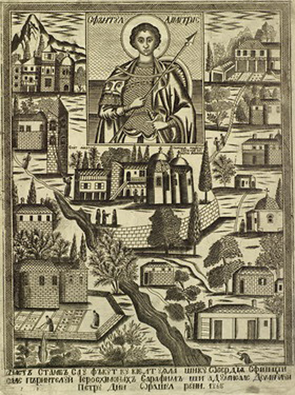 Изображение той или иной обители представляло собой панорамный вид сверху, на нем можно было разглядеть здания монастыря и сцены монашеской жизни. В верхней части листа обычно помещался образ, во имя которого монастырь был основан, а по сторонам нередко располагались сцены чудес и изображения святых покровителей обители. В нижней части листа гравировался текст, сообщавший, на чьи средства и по чьему благословению была выполнена гравюра. Иногда указывалось место создания иконы и имя мастера. В афонской гравюре особенно ярко прослеживается связь с иконописью. Греческие мастера выработали особый прием моделировки ликов пунктиром. Стремясь придать образу «живоподобность» поздневизантийской иконописи, в тенях на ликах граверы применяли специальные инструменты — рулетки, оставляющие на поверхности медной доски многочисленные скопления точек.