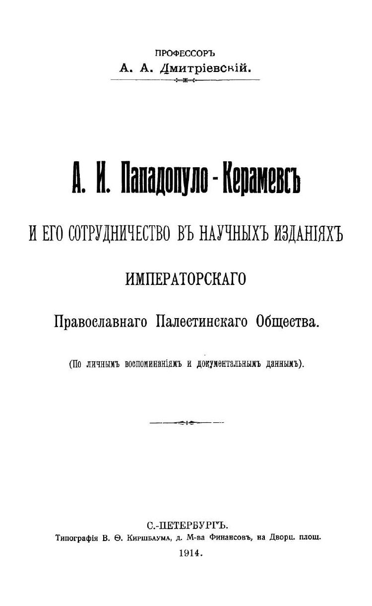 Дмитриевский, Алексей Афанасьевич - А.И. Пападопуло-Керамевс и его сотрудничество в научных изданиях Православного Палестинского общества: (По личн. воспоминаниям и документ. данным). Санкт-Петербург - тип. В.Ф. Киршбаума. 1914 г.