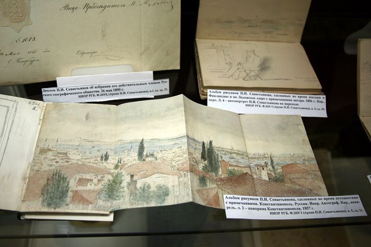 После расформирования Румянцевского музея в 1924 г. собрание было поделено еще раз. Часть коллекции - рукописи, автографы, книги, альбомы с рисунками и фотографиями, а также архив П.И. Севастьянова из собрания Румянцевского музея переданы в Российскую государственную библиотеку. Среди них записные книжки, представляющие собой малоформатные альбомы, заполненные филигранной работы рисунками. На одном из них — изображение могилы матери, похороненной в Донском монастыре. Целая галерея пейзажей, городских видов, жанровых сценок.