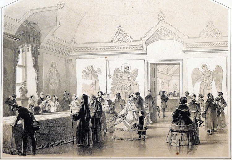Выставка Севастьяновского собрания копий и снимков с хранящихся на Афоне предметов искусства в зале Священного Синода в феврале 1859 г. Русский художественный листок В. Тимма. 1859 г. № 8. РНБ. Отдел эстампов