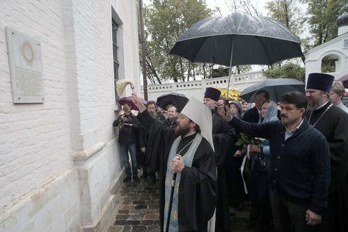 Далее все направились к наружной стене храма, где укреплена восстановленная памятная доска с изображением знака Императорского Православного Палестинского Общества и надписью, исполненной в старой орфографии:
