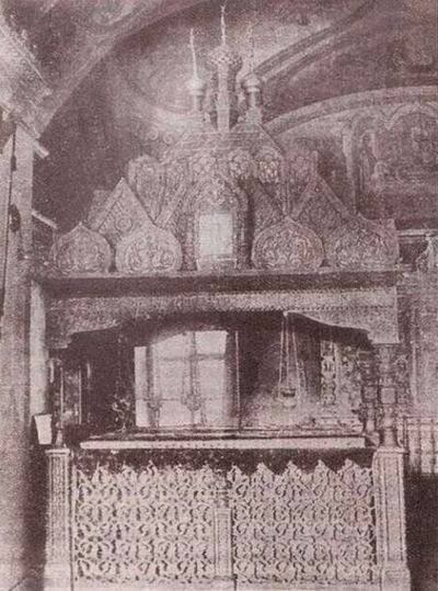 «Осмотревши гробницу,— пишет отец Иаков,— взошли мы в Богородицерождественский храм, где я обратил внимание их Величеств на дубовые связи, которые связывают восточную стену церкви.
