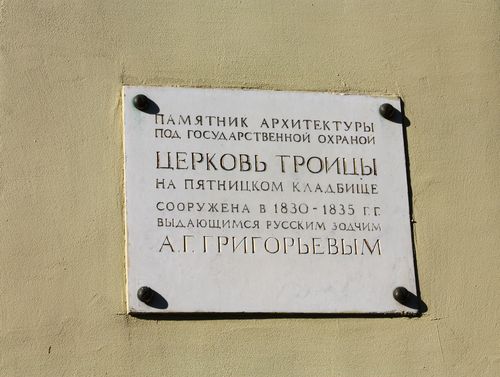 С 1815 года по 1845 настоятелем храма был известный московский проповедник протоиерей Федор Семенович Протопопов (1792-1845). Именно благодаря о. Федору в 1830 году на месте деревянного храма была заложена каменная церковь, которая была освящена в 1835 году во имя Святой Троицы Живоначальной. Название кладбища (Пятницкое) — получило от придела храма Святой Троицы — Параскевы Пятницы. Автором нового храма стал известный архитектор А. Г. Григорьев, создатель архитектурного комплекса на Ваганьковском кладбище. В конце XIX века и в начале XX века Пятницкое кладбище было преимущественно купеческим. Обычные для того времени надгробные памятники в виде часовен из черного мрамора можно увидеть как в центральной части кладбища, недалеко от храмов, так и в отдаленных его частях. Купеческие надгробия удивляют своей типичностью и аскетичностью, здесь нет места плачущим ангелам, богатым вазонам и статуям.