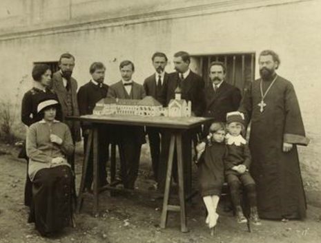 Бари. Строительная комиссия ИППО с членами семей рядом с макетом храма и приюта для паломников.