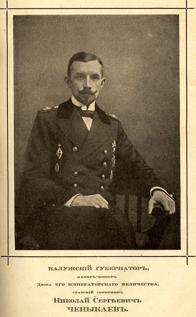 Николай Сергеевич Ченыкаев происходил из дворян Калужской губернии, он много лет активно трудился на благо России. Был представителем Министерства Внутренних Дел в комиссиях при Военном министерстве, при Главном штабе Военного министерства, при Министерстве торговли и промышленности. С 1912 по 1915 годы он Минский вице-губернатор, а с 1915 года по 1917 год Калужский губернатор. В Калуге возглавлял губернское отделение Комитета по оказанию благотворительной помощи семьям лиц, призванных на войну, за что ему была объявлена благодарность Великой Княгини Елисаветы Феодоровны и пожалован жетон с драгоценными камнями «за развитие и оживление деятельности отделения Комитета». Состоял председателем или почетным членом многих комитетов и комиссий и активно трудился на благо Калужского отдела Императорского Православного Палестинского Общества, где был заместителем председателя. Много раз Николай Сергеевич посетил Сергиев скит Калужского отдела ИППО, развитию которого он отдал много сил. Февральский переворот 1917 года Николай Сергеевич не принял и был отстранен от должности. Он проживал в Москве, был не раз арестован, прошел тюрьмы и лагеря, в последние годы проживал в городе Кунцево, где был арестован 3 октября 1937 года.