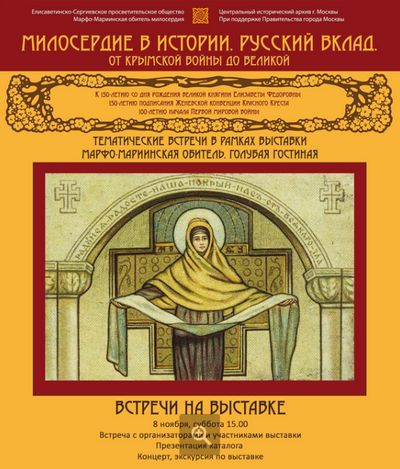 8 ноября в Марфо-Мариинской обители милосердия в 15:00 в Голубой гостиной состоится тематическая встреча, концерт и презентация каталога в рамках выставки "Милосердие в истории. Русский вклад. От Крымской войны до Великой", подготовленной и открытой в обители Елисаветинско-Сергиевским просветительским обществом в связи с юбилейным годом 150-летия со дня рождения Великой княгини Елизаветы Федоровны. Открытие выставки состоялось 14 октября в