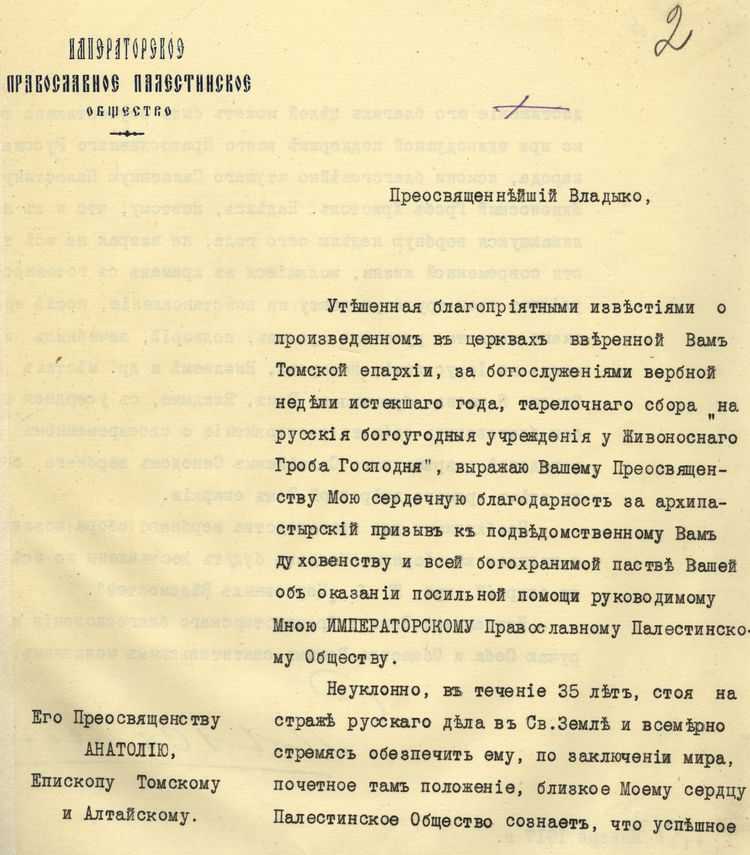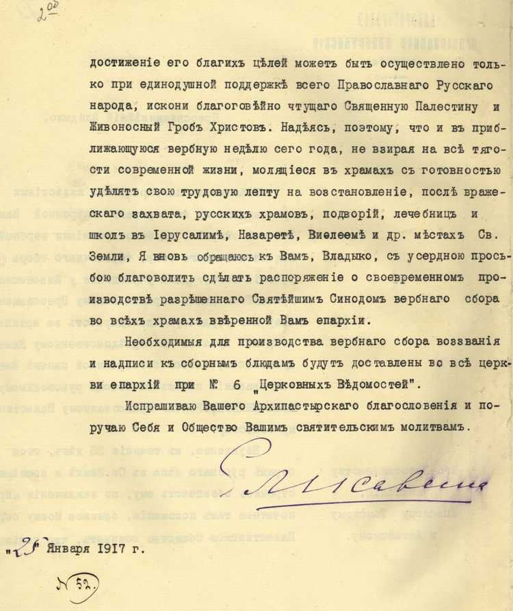 Несколькими днями ранее пришло письмо с аналогичной просьбой от Августейшей председательницы Общества великой княгини Елизаветы Федоровны. (см. илл.) Делу был дан ход, и в то время, когда в Петрограде начинали разворачиваться демонстрации и забастовочное движение, предварившее падение самодержавия, Томским епархиальным архиереем предлагается всем настоятелям церквей епархии организовать сбор «на нужды русских богомольцев у Живоносного Гроба Господня во время богослужений в праздник Входа Господня в Иерусалим, предварив его чтением воззвания и поучениями, соответствующими значению сего сбора и тем целям, на которые он производится» (ГАТО. Л. 1.).