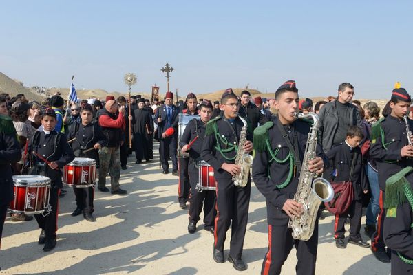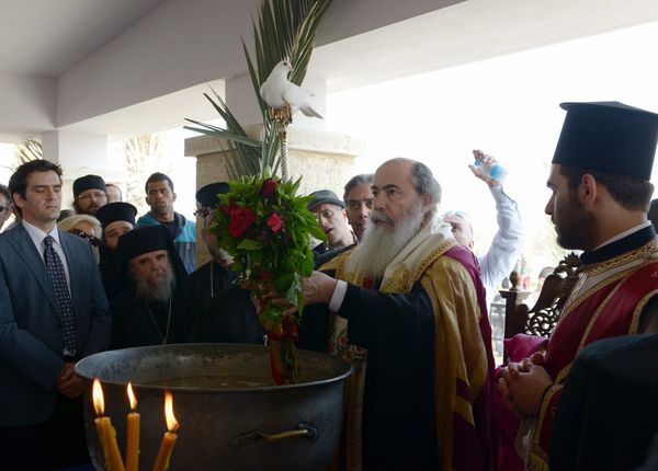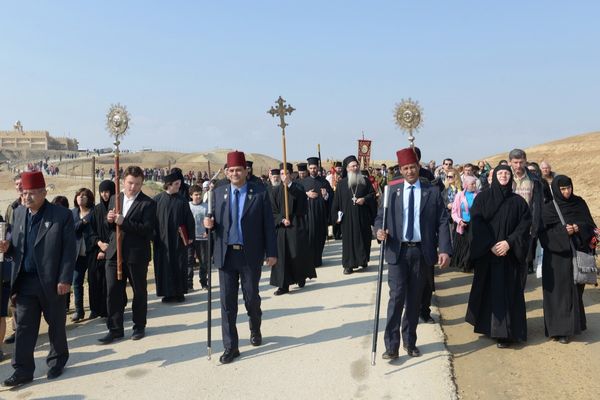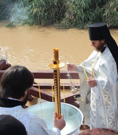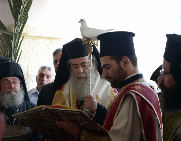 Под специально устроенной сенью при большом стечении народа Иерусалимский Патриарх совершил вечерню и чин великого освящения воды. Затем он с сидящим на жезле белоснежным голубем спустился к реке, чтобы погрузить крест в иорданские воды.