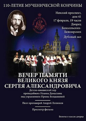 17 февраля 2015 года, в день 110-летней годовщины мученической гибели великого князя Сергея Александровича, в Санкт-Петербурге во дворце Белосельских-Белозерских состоится вечер памяти. Начало в 19.00.