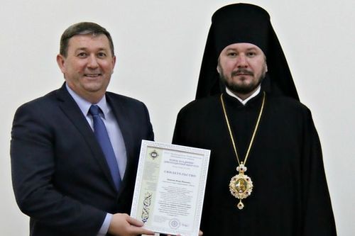 В завершении заседания Преосвященнейший епископ Симон вручил заместителю главы Администрации г. Шахты Игорю Ивановичу Медведеву Свидетельство участника XXIII Международных Рождественских образовательных чтений. Игорь Иванович в январе принял непосредственное участие в работе Чтений и выступил на международной научно-практической конференции «Русский мир и Святая Земля: страницы прошлого и живая летопись настоящего» в Центре Императорского Православного Палестинского Общества в Москве.