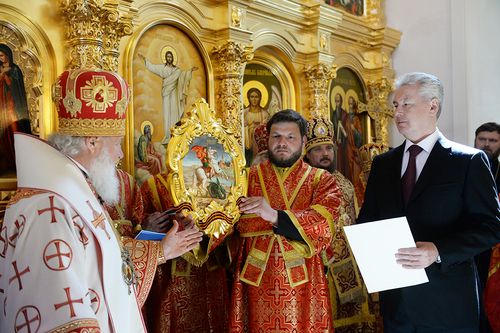 Мэр г. Москвы С.С. Собянин был удостоен Патриаршего знака храмостроителя. Также в преддверии празднования 70-летия Победы Предстоятель Русской Церкви вручил столичному градоначальнику икону святого великомученика Георгия Победоносца.
