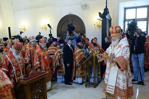В канун юбилея Победы Предстоятель Русской Церкви освятил храм Преображения Господня в Москве